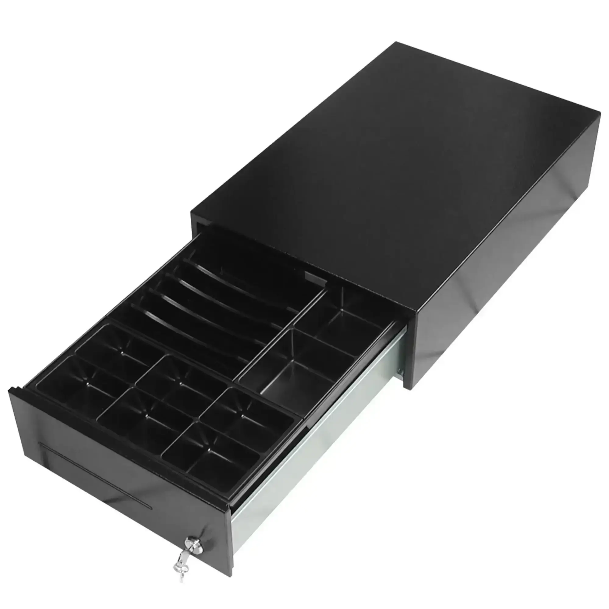 Very practical and taking up little space, this cash drawer comes with storage for 8 trays for coins and 5 trays for notes.
